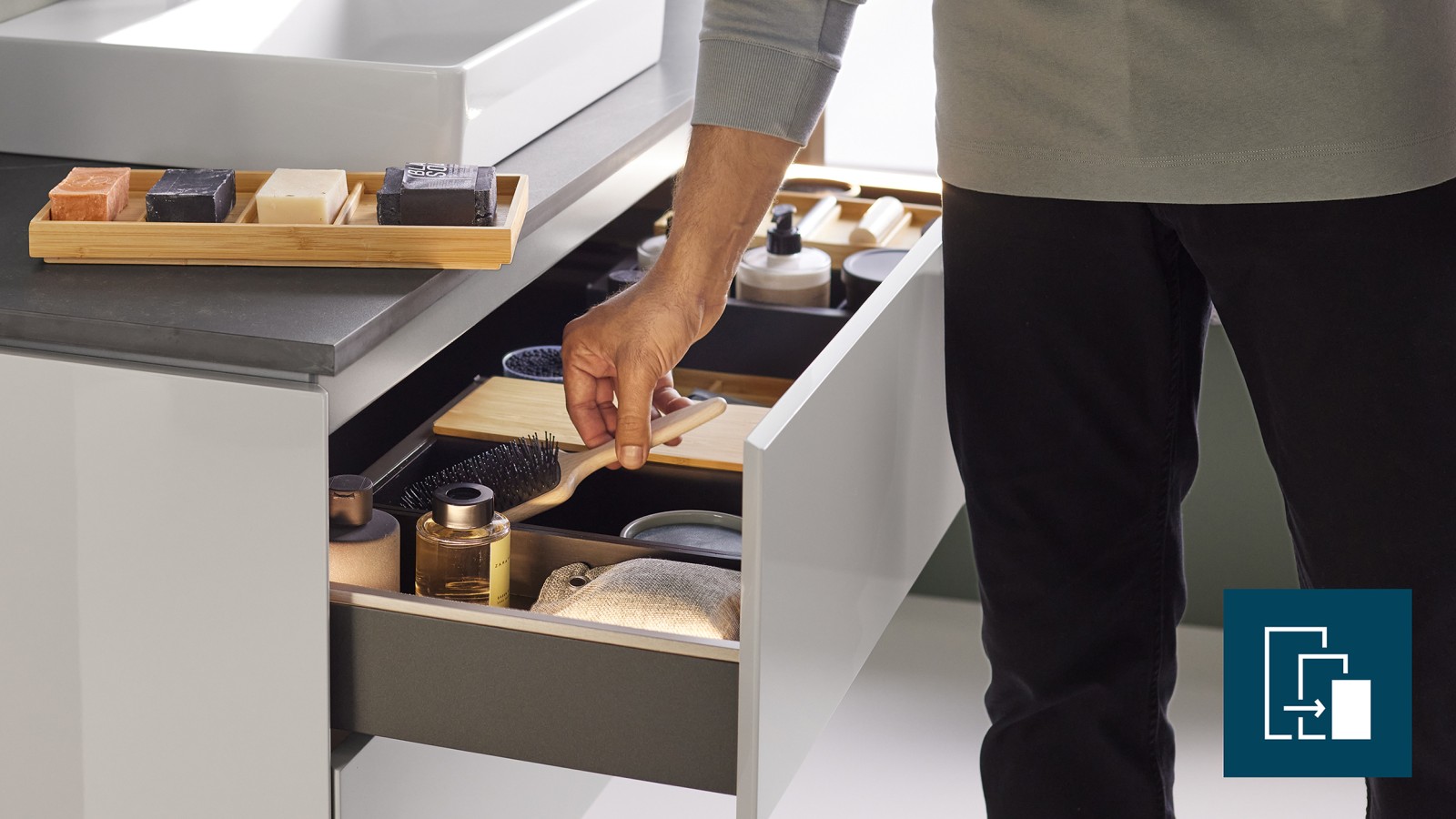 What’s inside matters too! Bathroom essentials can be neatly stowed away in storage boxes and organizers in the drawer. For example, shown here is a modular organization system with bamboo- and lava-colored insert compartments. The modular sets are optimized for every drawer width and are available as options.